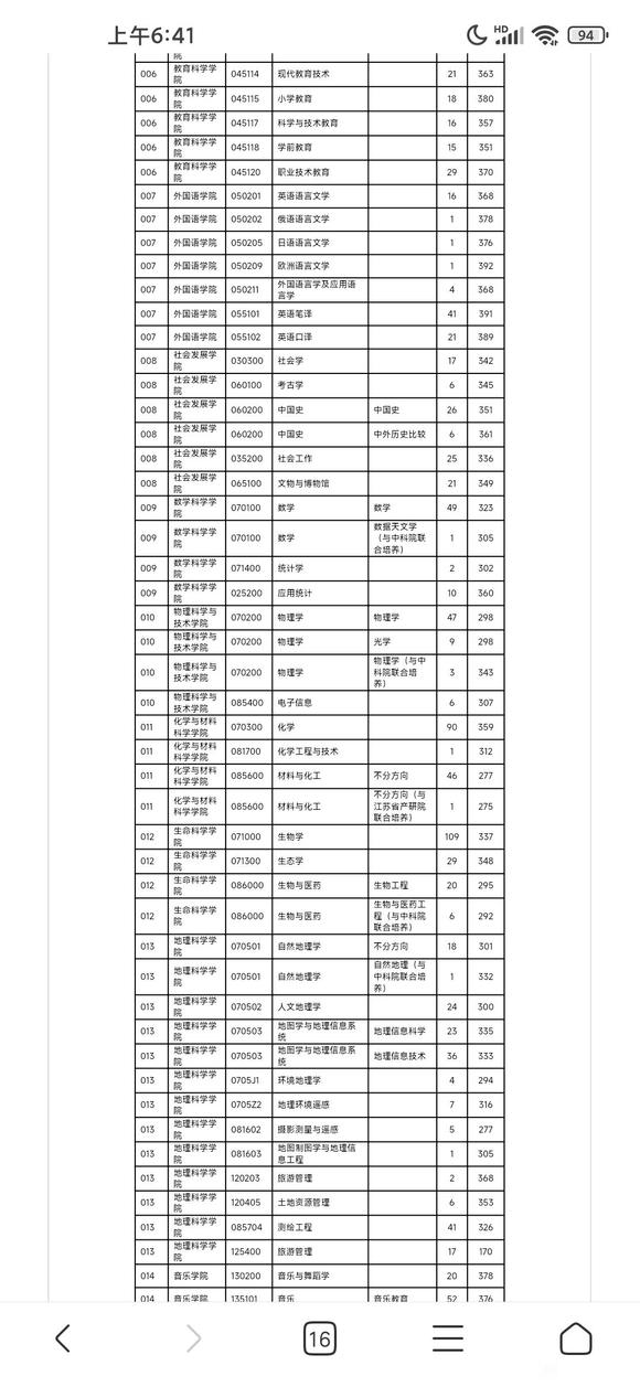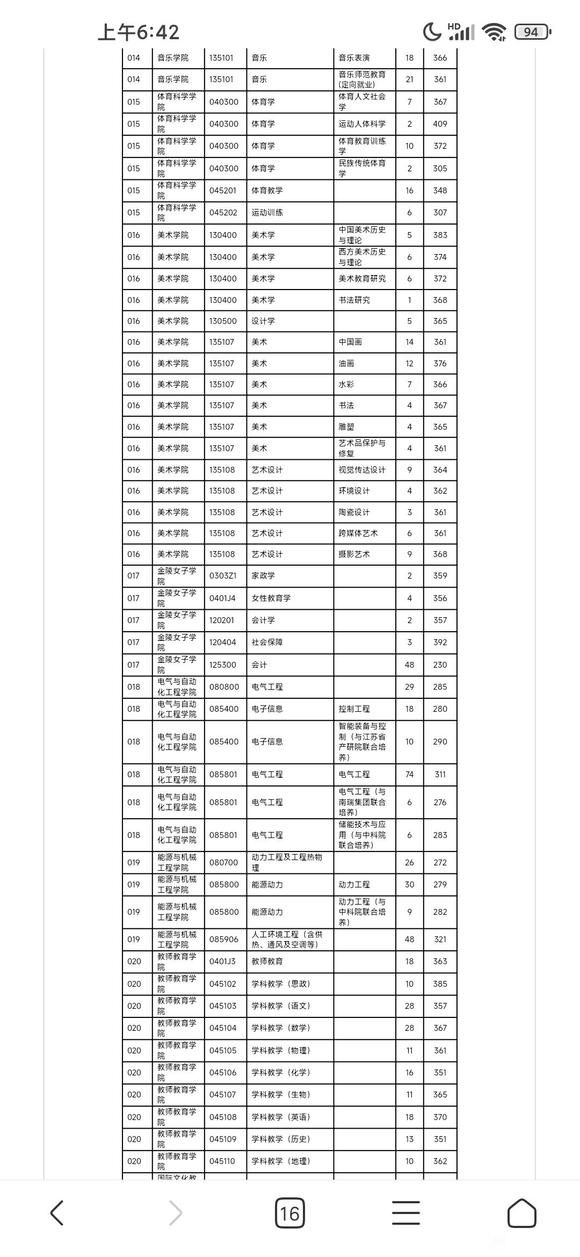 最后说下师范类专业。教育科学学院,学前教育380,教育史354,小学教育361,现代教育技术363。美术学院分数基本在361到368之间,体育科学学院最高409,最低307,落差也比较大。