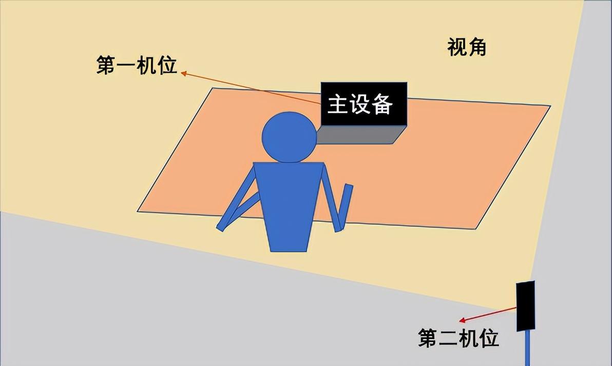 3.考生面试时,全程正面免冠朝向摄像头,保持坐姿端正,保证头肩部及双手出现在视频画面正中间。考生复试应开启两台设备摄像头,主机位设备摄像头对准考生本人(视角如图1所示),辅机位设备摄像头从考生侧后方45°拍摄,要保证从考生面前和身后完整拍摄到考生全身、考生考试屏幕能清晰地被复试专家组看到(视角如图2所示)。
