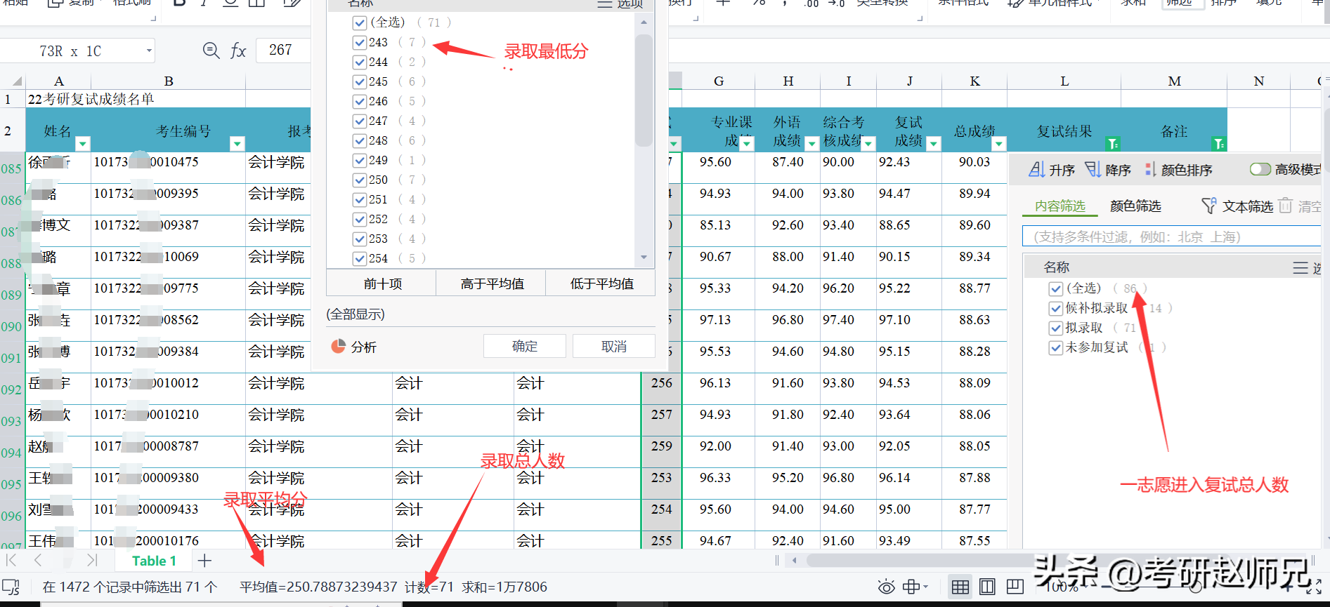 我们看下面的信息,一志愿总共进入86人,最终录取71人,录取最低分243分,平均分250多分。