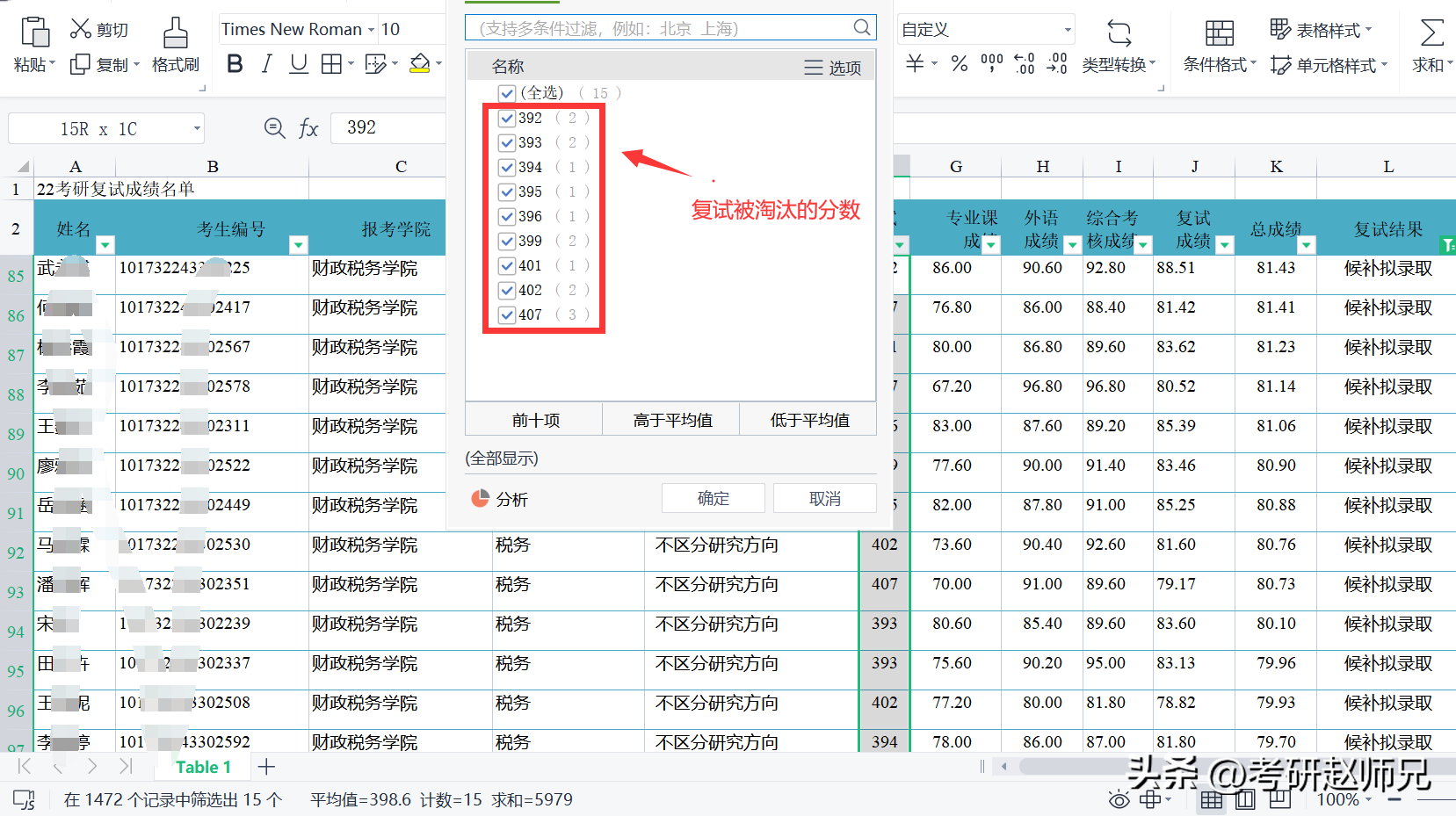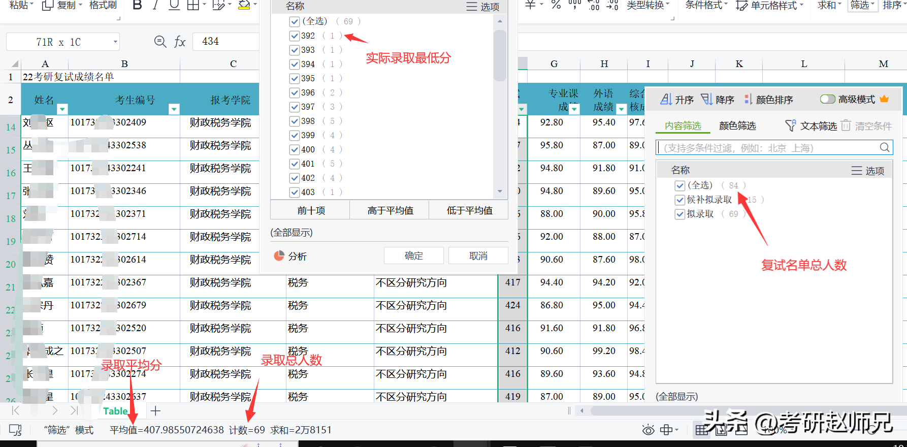 从下表看到没有调剂,一志愿总共进入59人,淘汰12人,最低分372分,平均分389分。