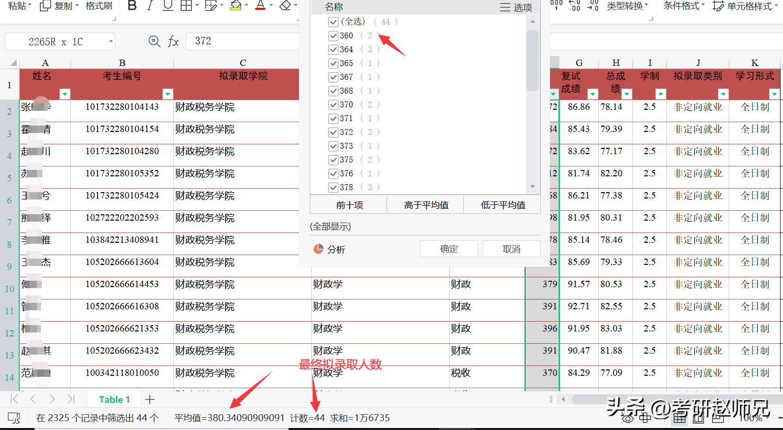 最终拟录取44人,加上一志愿11人,相当于调剂录取33人,平均分380左右。