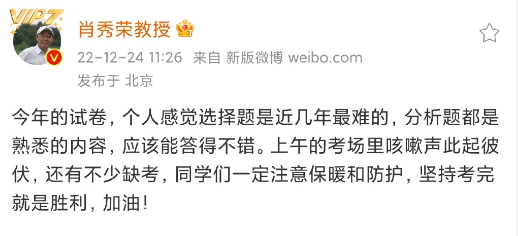 第一天上午考完政治后,不少同学都说今年的政治选题很难,肖秀荣老师也说到“选择题是近几年最难的”。