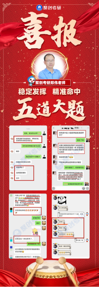 此外,近两年应对考研押题,出题人也有对应的“反押题”,近两年考研政治的肖四似乎没怎么压中大题,但各位同学也无需过于担心,只要大家背了冲刺卷,积累时政语言,考试时结合材料,拿捏住大体方向,分数都不会太差。背了我们聚创【郑伟老师】5张纸的同学那就更稳了,今年郑伟老师仍稳定发挥,大题精准命中!