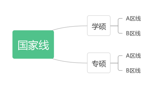 国家线按照学位分类可分为学硕线和专硕线,根据考生报考院校的所在地区分类又可以分为A区线和B区线,详细分类如上图。