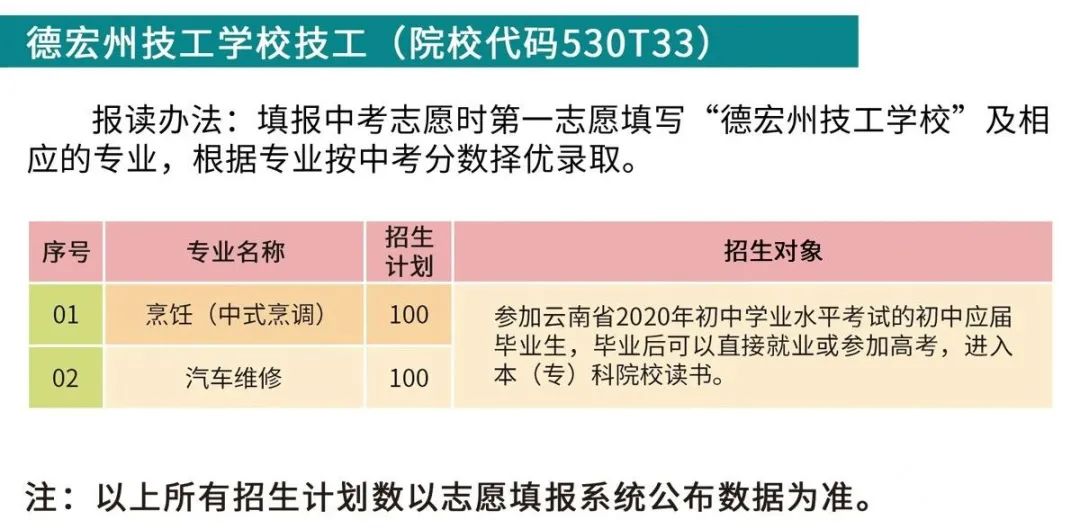五年制专科、中专、技工面向云南全省招生,根据平行志愿系统择优录取。