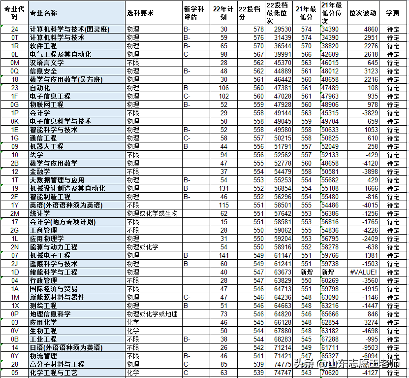 山东科技大学大部分的专业都是在常规批录取,每年的招生计划略有变化,22年新增了计算机的图领班,也是本校录取专业的最高分578分,最低分是工业设计(中外合作办学)478分,学费一年5.5万,最高分和最低分专业分差100分,所以报志愿也不要只看学校录取最低分,还是要看你想报考哪个专业,不同专业之间分数差距还是非常明显的。具体分数如下图: