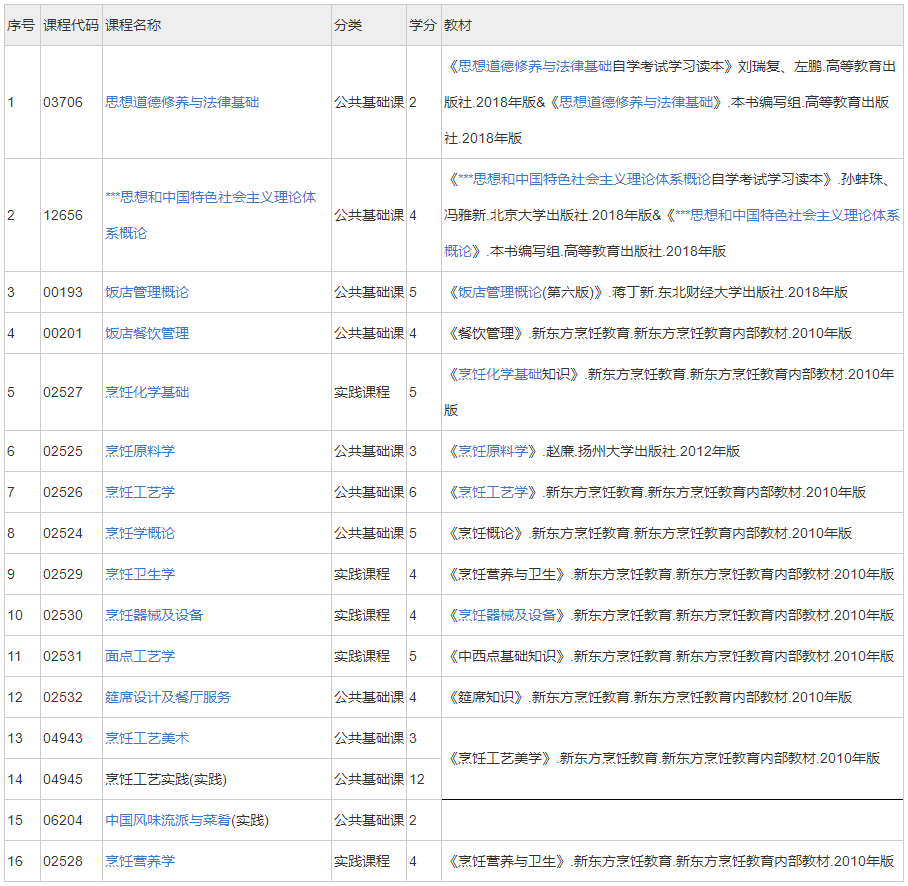 那么烹饪专业专升本考什么,不同的院校考试的自考烹饪专业科目与自考烹饪专业教材不一样,以主考院校为准,仅供参考: