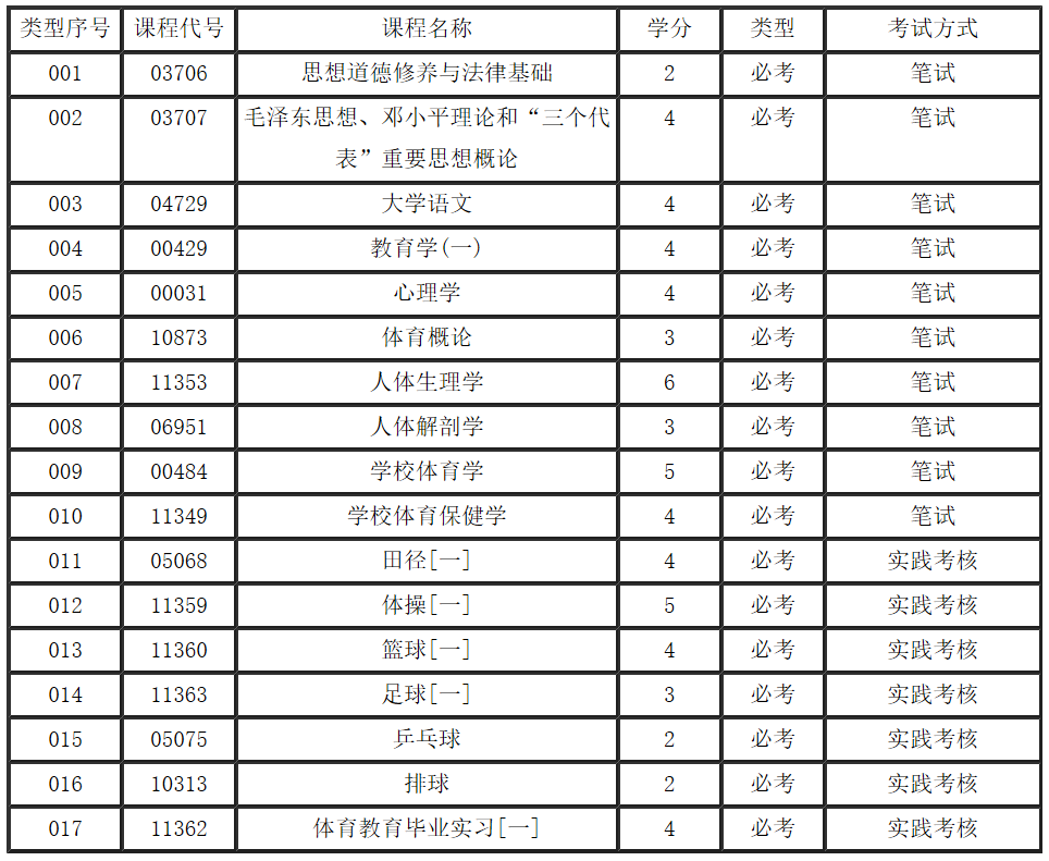 体育教育自考专科科目设置:思想道德修养与法律基础、毛泽东思想、*理论和“三个代表”重要思想概论、大学语文、教育学(一)、心理学、体育概论、人体生理学、人体解剖学、学校体育学、学校体育保健学、田径[一]、体操[一]、篮球[一]、足球[一]、乒乓球、排球、体育教育毕业实习[一]等。
