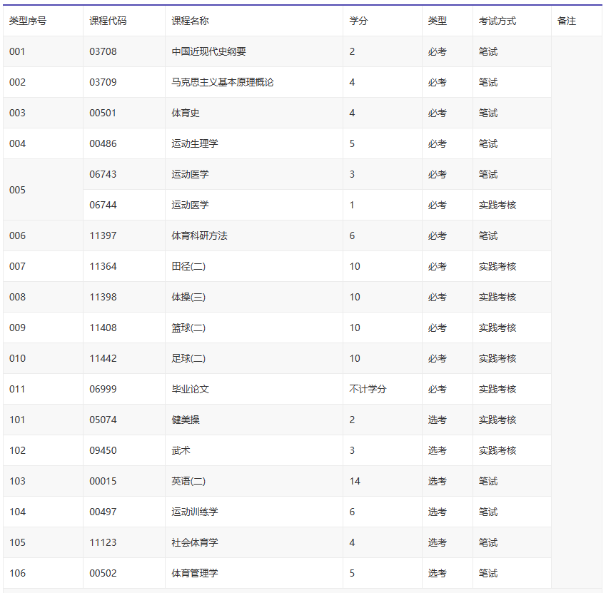 自考体育教育本科课程设置:必考课11门65学分;选考课6门34学分。