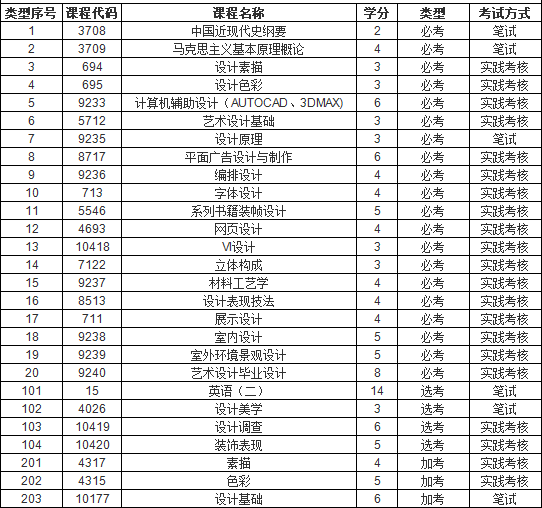(2) 自考本科艺术设计选考科目:英语(二)、设计美学、设计调查、装饰表现等;