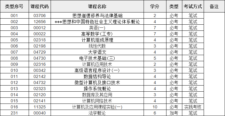 自考计算机专科科目:思想道德修养与法律基础、毛泽东思想和中国特色社会主义理论体系概论、英语(一)、高等数学(工专)、计算机组成原理、线性代数、大学语文、电子技术基础(三)、计算机应用技术、高级语言程序设计(一)、数据结构导论、微型计算机及接口技术、操作系统概论、数据库及其应用、计算机应用课程实验(一)、法学概论等。