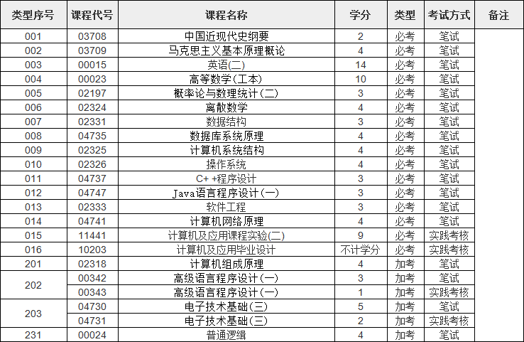 计算机自考本科科目:中国近代史纲要、*基本原理概论、英语(二)、高数数学(工本)、概率论与数理统计(二)、离散数学、数据结构、数据库系统原理、计算机系统结构、操作系统、C++程序设计、Java语言程序设计(一)、软件工程、计算机网络原理、计算机及应用课程实验(二)、计算机及应用毕业设计、计算机组成原理、高级语言程序设计(一)(笔试+实践考核)、电子技术基础(三)(笔试+实践考核)、普通逻辑等。