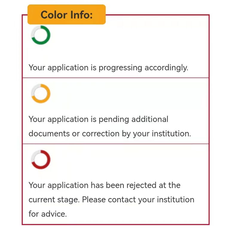 ● 红色:你的申请现阶段被拒绝了,请联系机构(学校、中介等)寻求建议。