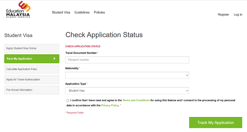 学生在提交所需的资料后就可以通过EMGS查询进度。学生在输入护照号码及国籍,并点击“我已阅读相关事项”后,就可以进入查询页面。